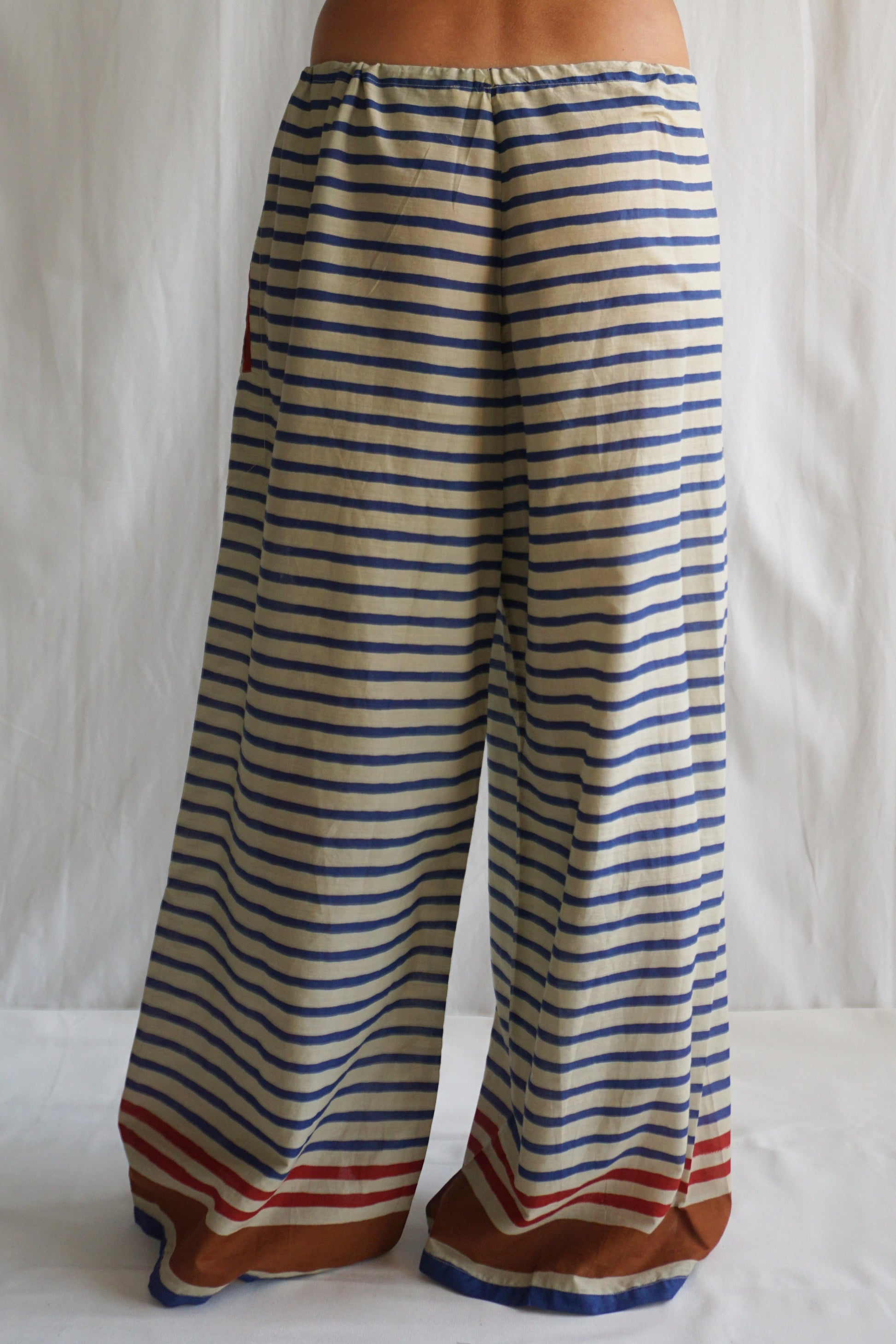 Relaxed and comfortable wide-leg pants in breathable cotton, featuring hand block-printed horizontal stripes in blue and natural tones. Accented with rust and cobalt details at the hem and side pockets, and finished with a soft drawstring waist for an adjustable fit.